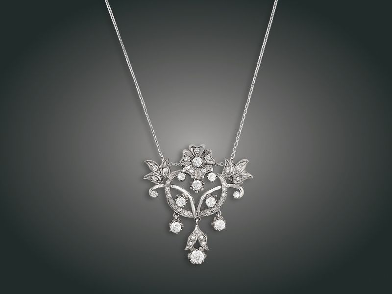 Kikiáltási ár: 220 000 FtLánc art deco függővel Fehérarany 585, vékony anker láncon csüngős fazonú, áttört függelék, 15 régi és achtkant csiszolású briliáns cca. 0,30 ct, J, SI1-P1, 3,1 g, hossz: 50 cm