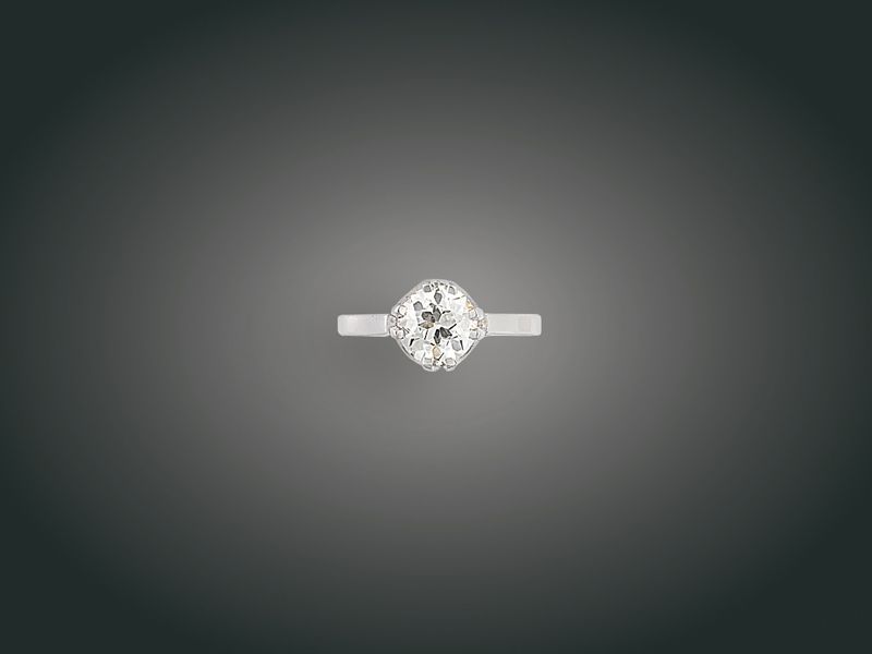 Kikiáltási ár: 260 000 FtBriliáns gyűrű Fehérarany 585, középen kézi fűrészelt foglaltban 1 nagyobb, régi csiszolású briliáns cca. 0,80 ct, O, SI2, 1940 körül, 2,3 g, méret: 56