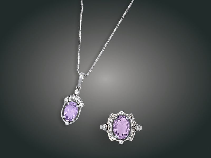 45. tétel, Garnitúra, 3 db, 14 k au, 2 ametiszt cca. 5,5 ct, 23 bril. cca. 0,80 ct, 8,4 g