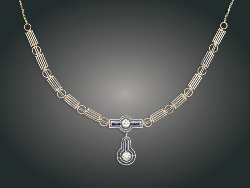 80. tétel, Nyakék, 14 k au, 2 bril. cca. 1,30 ct, zafír, 21,5 g