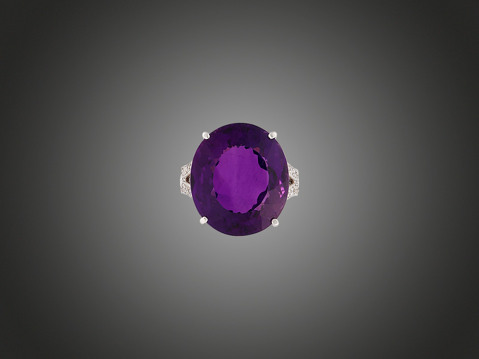 Fehérarany 585, középen karmos foglalatban nagy, ovális csiszolású ametiszt cca. 18,00 ct, gyűrűvállba foglalt 18 modern csiszolású briliáns cca. 0,45 ct, J, SI-P1, 8,8 g, méret: 52