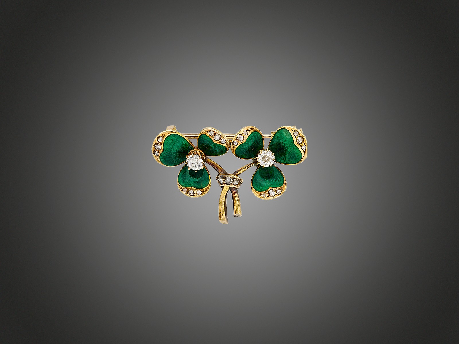 Arany 580, dupla lóhere motívum zöld zománc díszítéssel, 2 régi csiszolású briliáns cca. 0,30 ct, J, VS és 21 gyémánt cca. 0,10 ct, 1900 körül, 6,6 g