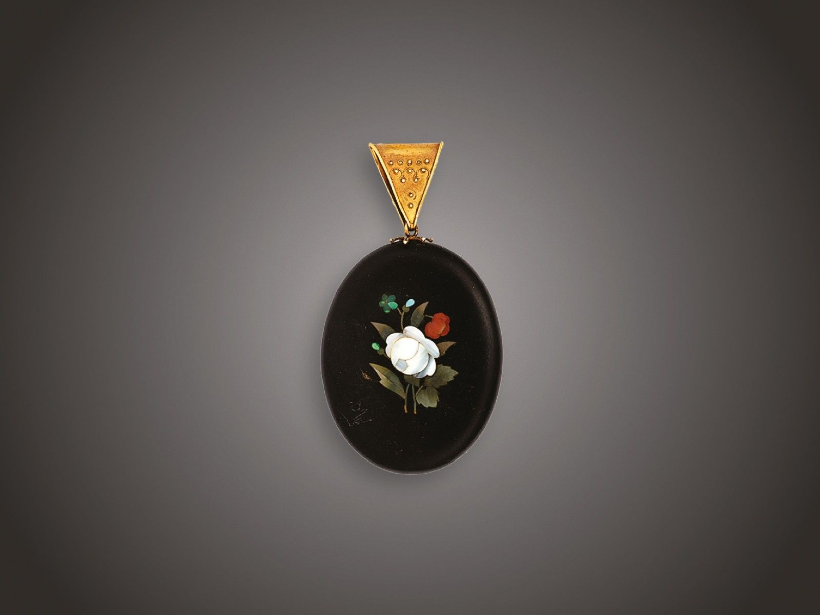 Arany keretezésű fényképtartós függelék. Előlapján virágcsokor ábrázolás színes kőintarziával (pietra dura). Felülete kissé karcos.
