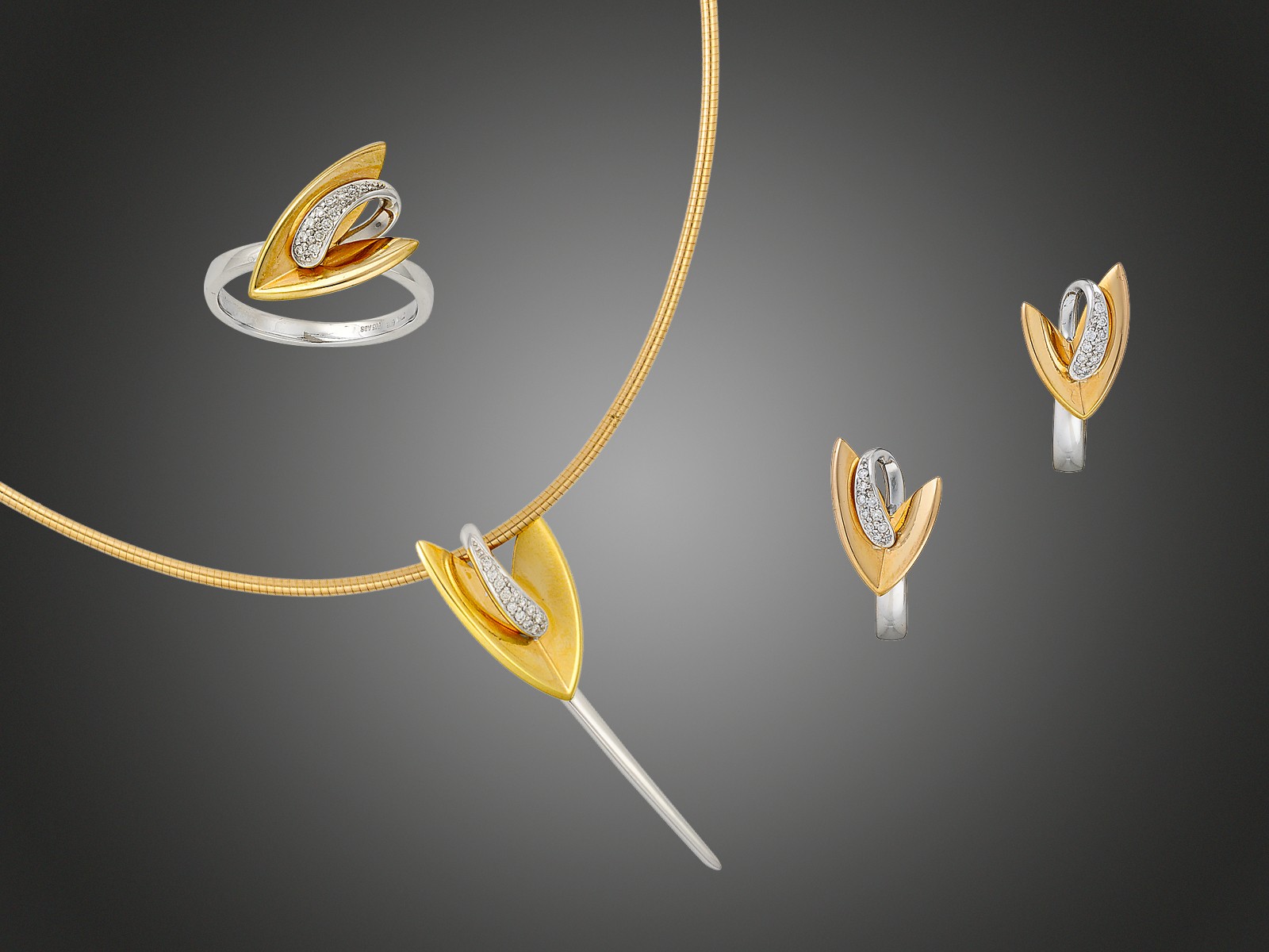 Rozé- és fehérarany 750, design gyűrű, fülbevaló és csúszkás medál masszív kígyó láncon, 42 modern csiszolású briliáns cca. 0,45 ct, G, VVS, beszúrós patentzárral, 27,3 g, méret: 55, hossz: 45 cm