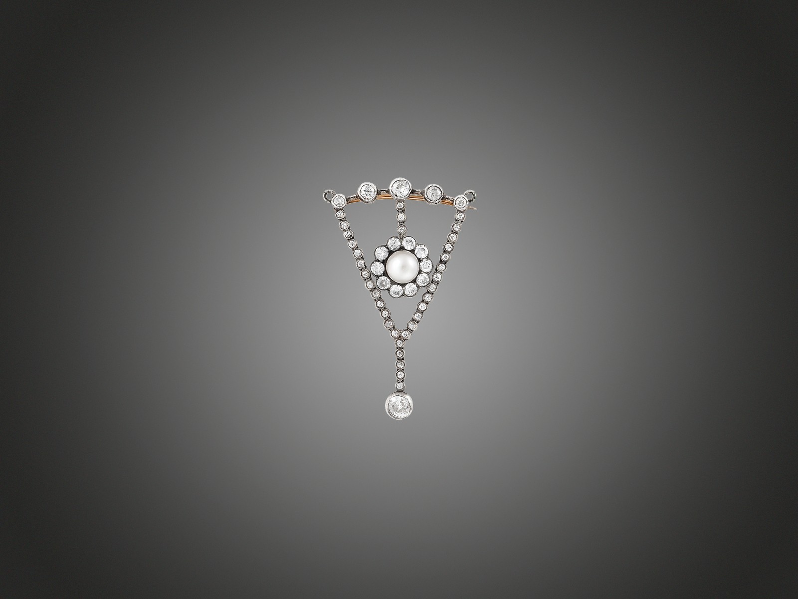 Kikiáltási ár: 280 000 FtLánc art deco függővel Fehérarany 585, vékony anker láncon csüngős fazonú, áttört függelék, 15 régi és achtkant csiszolású briliáns cca. 0,30 ct, J, SI1-P1, 3,1 g, hossz: 50 cm