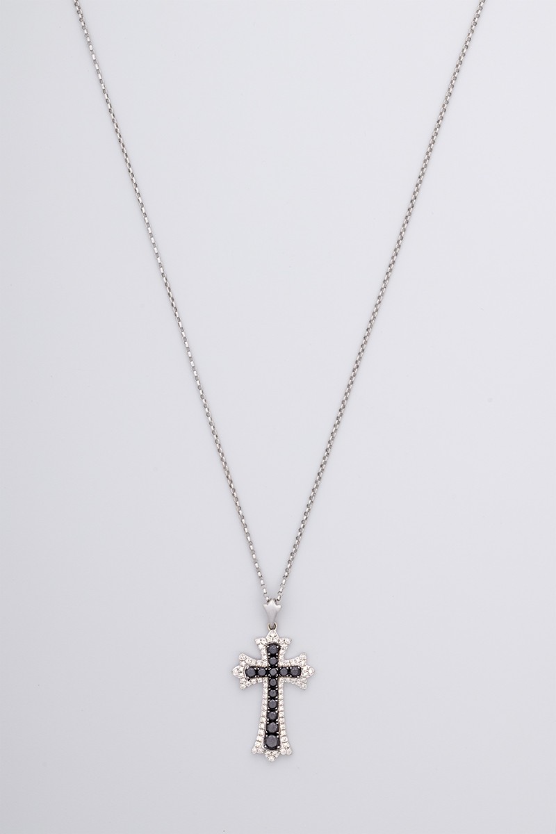Fehérarany 585, keresztforma függő, 71 színtelen és fekete, modern csiszolású briliáns cca. 0,60 ct, M, SI, 3,8 g, hossz: 44 cm