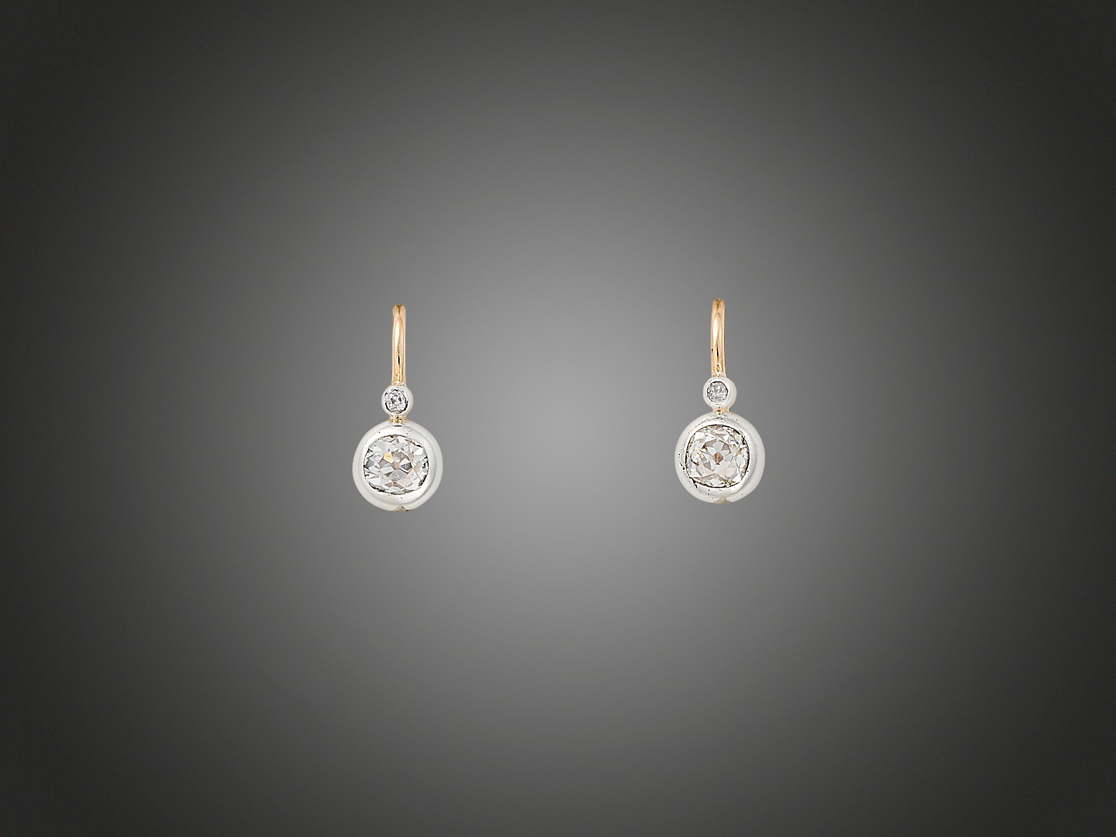 Arany 580 és ezüst, buton foglalt 2 nagyobb, régi csiszolású briliáns cca. 1,20 ct, M, SI és 2 kisebb briliáns cca. 0,03 ct, R2, M, SI, patentzárral, 2,6 g