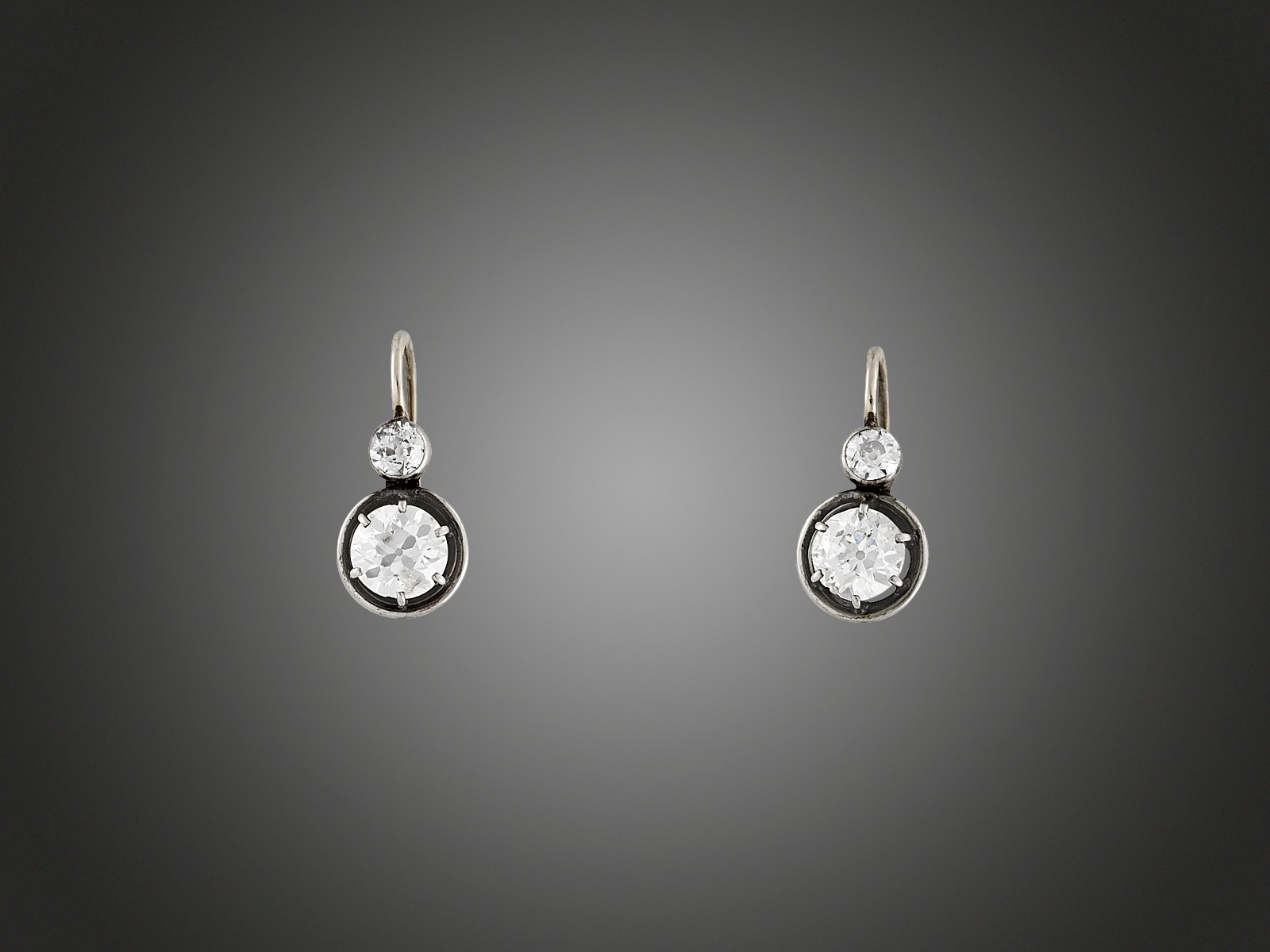 Arany 585, karmos foglalatban 2 nagyobb, régi csiszolású briliáns cca. 2,00 ct, K, P2, 2 kisebb briliáns cca. 0,40 ct, R2, K, SI-P1, patentzárral, 3,2 g
