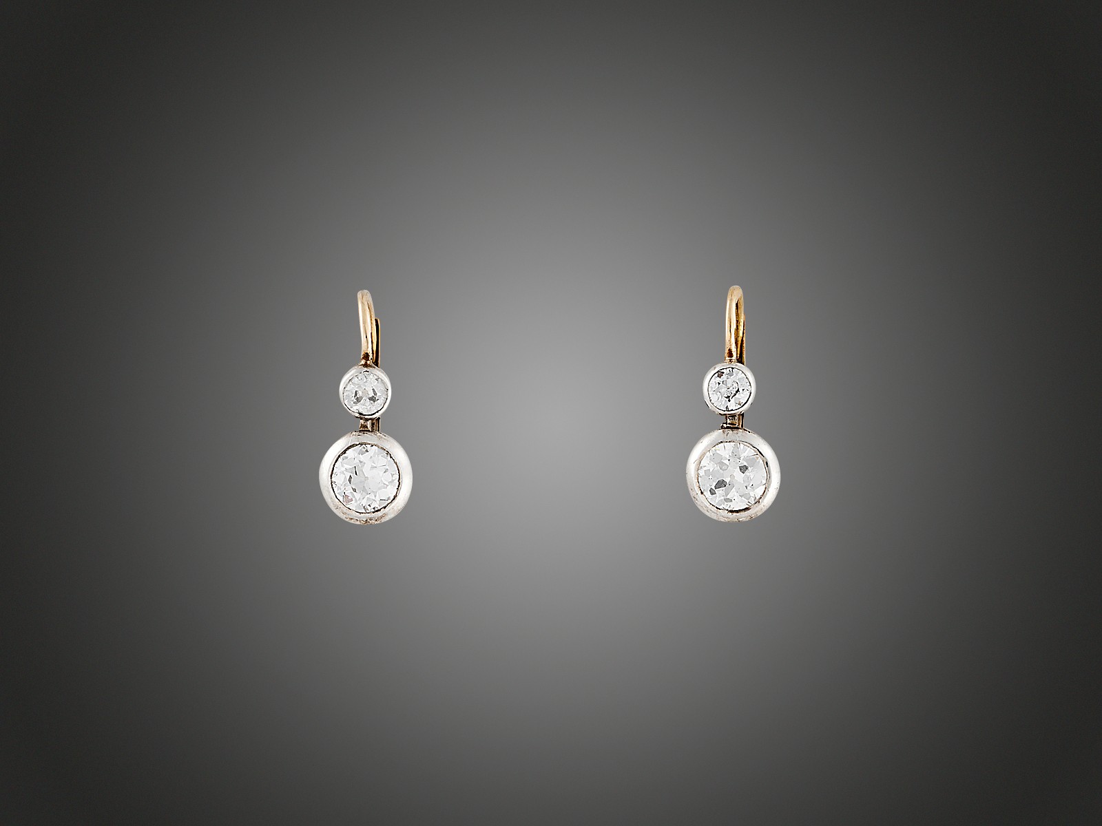 Arany 585, csüngős buton fazon, 2 nagyobb régi csiszolású briliáns cca. 1,20 ct, I, VS, 2 kisebb briliáns cca. 0,40 ct, R2, I, SI2, patentzárral, 1920 körül, 2,5 g