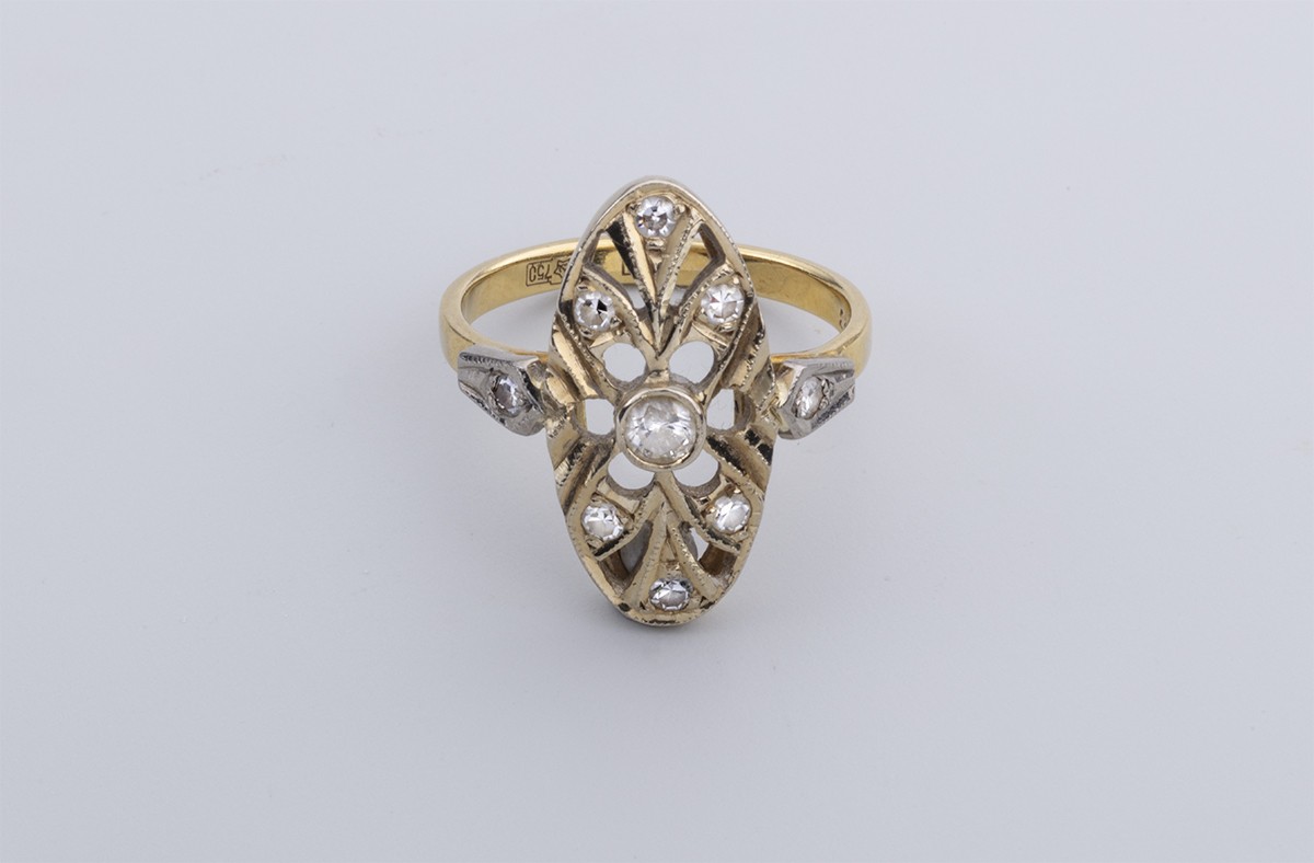 Arany 750, áttört fejen 9 modern és achtkant csiszolású briliáns cca. 0,23 ct, M, SI, 4,5 g, méret: 54