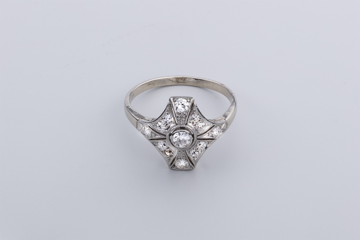 Kikiáltási ár: 260 000 FtArt deco briliáns gyűrű Fehérarany 585, geometrikus stílusú, 7 régi csiszolású briliáns és gyémánt cca. 0,60 ct, I, SI, után fémjelzett, 4,0 g, méret: 57