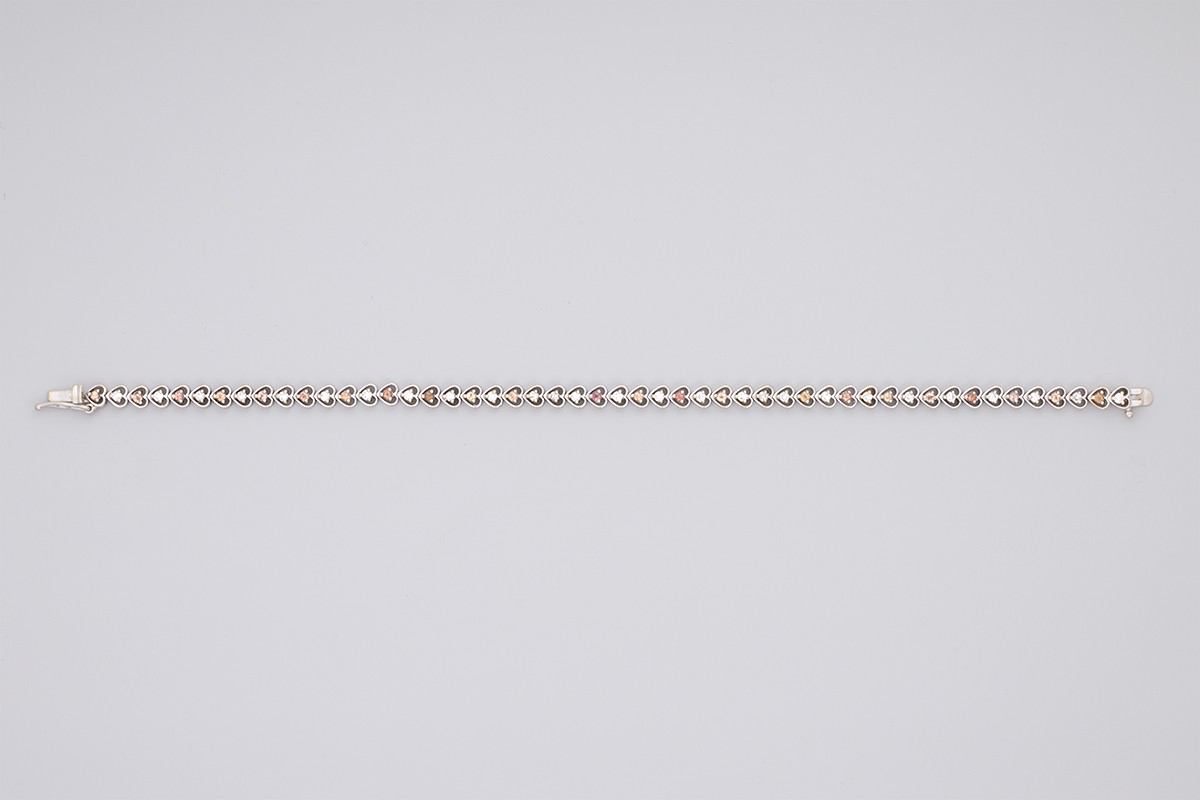 Fehérarany 750, sorban foglalt 25 apró, modern csiszolású briliáns cca. 0,50 ct, P, P2, váltakozó mintában apró rubinokkal, 6,0 g, hossz: 17,5 cm