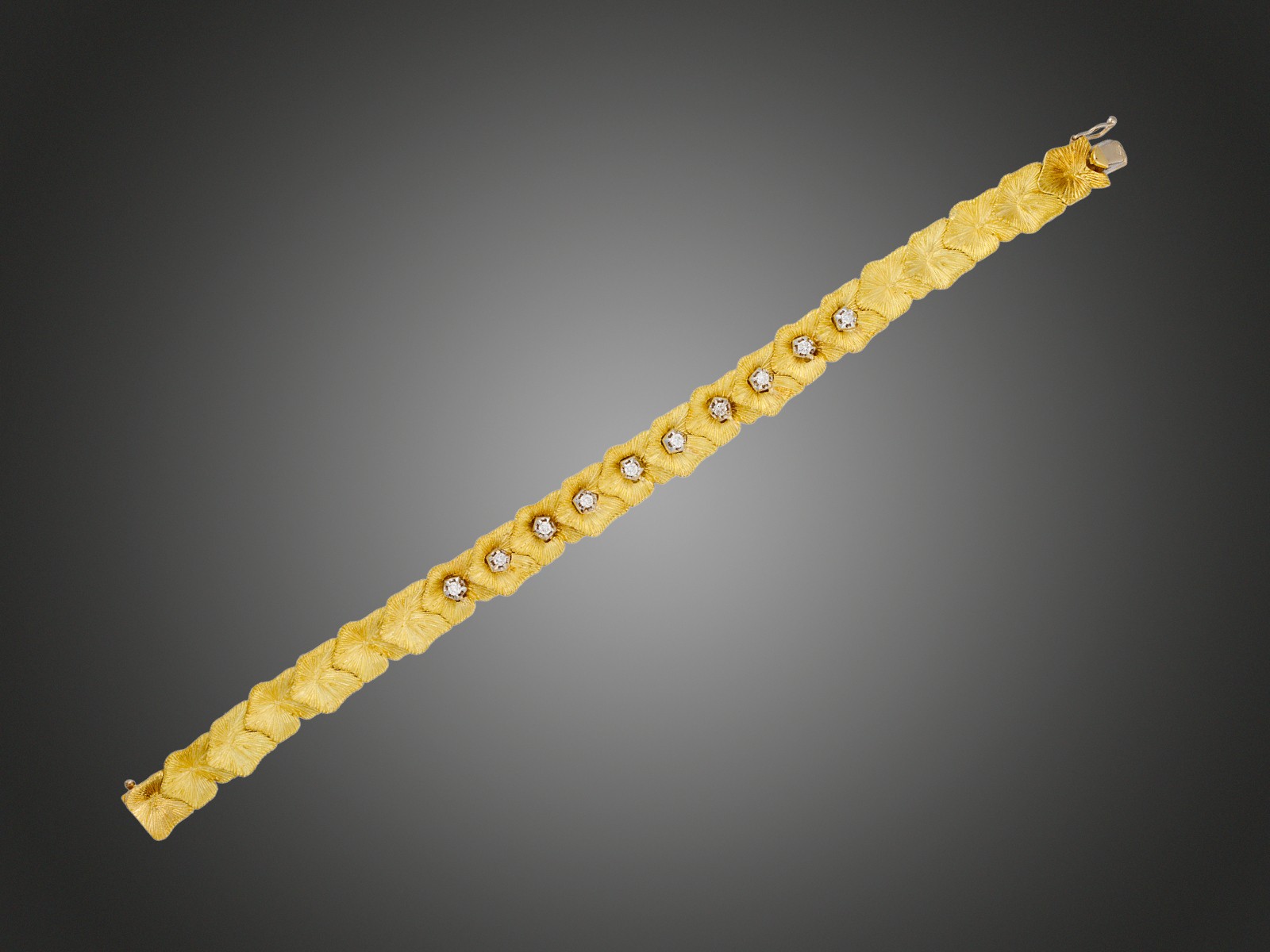 Arany 750, sorba rendezett levél motívumok, 10 karmos foglalású, modern csiszolású briliáns cca. 0,40 ct, H, VS, 40,9 g, hossz: 18,5 cm