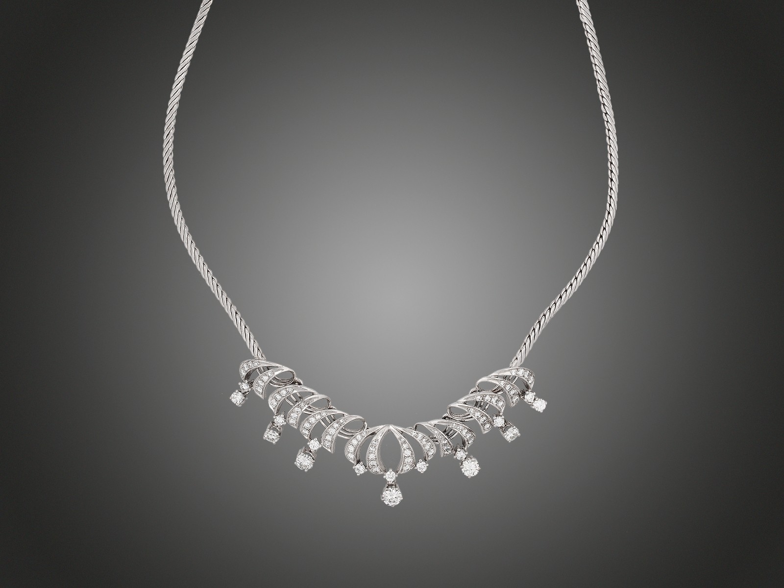 Fehérarany 585, középdíszén briliáns csüngőkkel, 88 modern csiszolású briliáns cca. 3,90 ct, G, VVS, nyelves zárral, 32,2 g, hossz: 45 cm