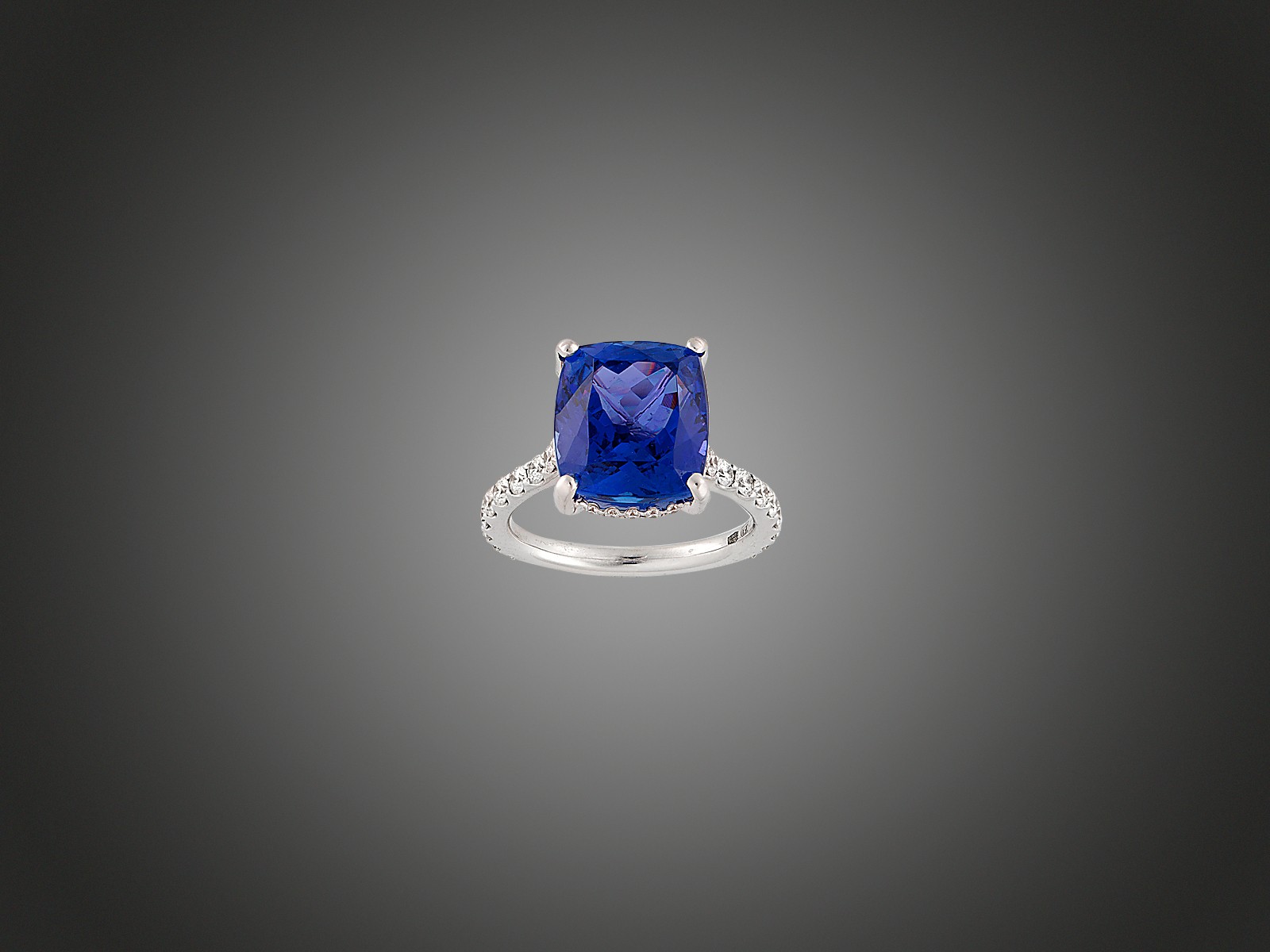 Fehérarany 750, középen párna csiszolású tanzanit cca. 6,50 ct, 22 modern csiszolású briliáns cca. 0,70 ct, H, VS, 5,4 g, méret: 51