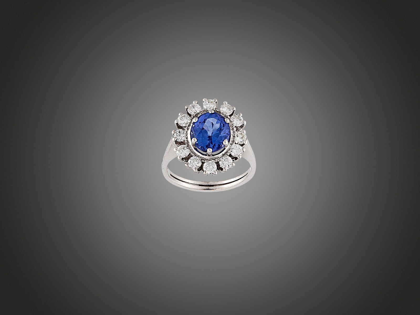 Fehérarany 750, karmazált fazonban 1 tanzanit cca. 2,70 ct, karmos foglalatban 12 modern csiszolású briliáns cca. 0,80 ct, I, VS, 6,5 g, méret: 54