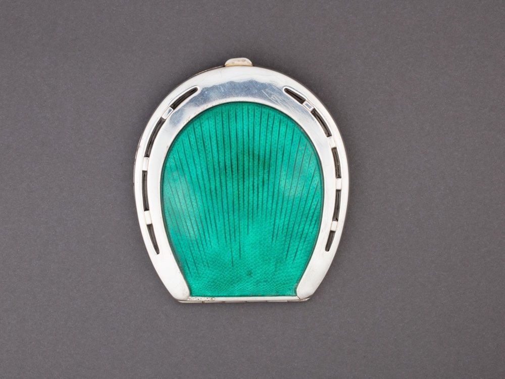 Ezüst 925, lópatkóforma, zsanéros, nyomógombos nyitódással, gilosált alapon zöld és fekete zománcdíszítéssel, belül aranyozott, német, 1900 körül, utólagos magyar fémjellel, 97,1 g, méret: 8×9 cm
