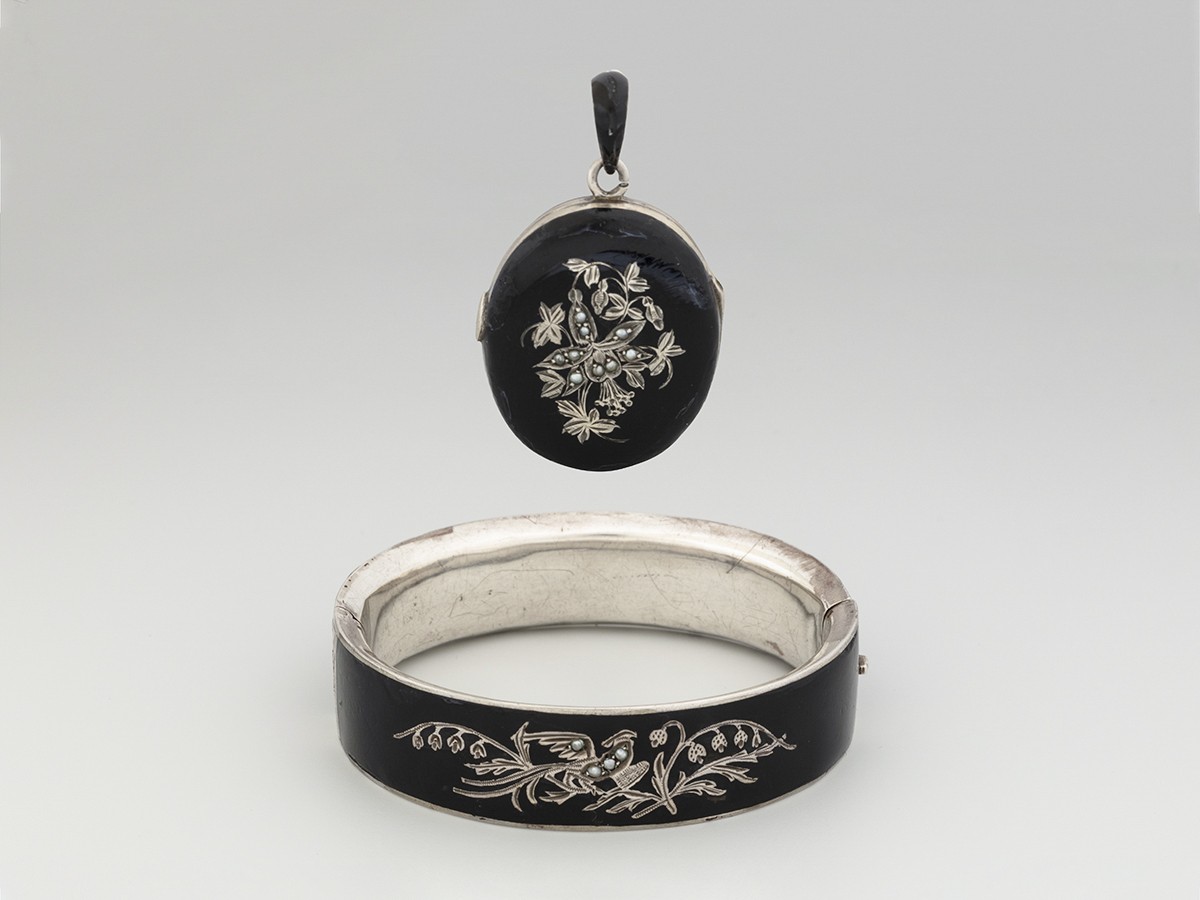 Ezüst 750, nyitható reif és fényképtartós medalion, fekete zománc és vésett mintában fél gyöngy díszítéssel, 1900 körül, 44,5 g, átmérő: 5,5 cm, zománc sérült