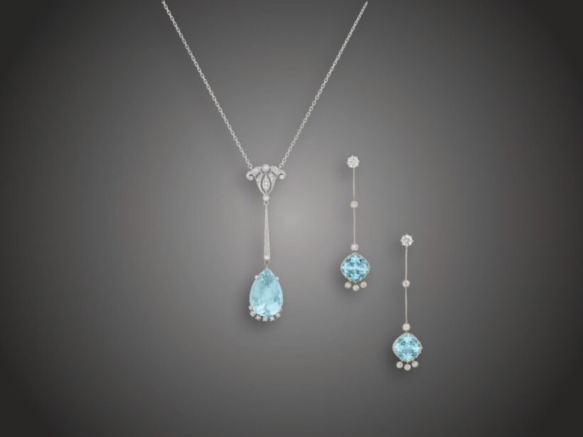 Fehérarany 585, nyakék vékony anker láncon cseppforma, fazettált csiszolású topáz csüngő, 16 briliáns cca. 0,25 ct (MTCrSi) és 5 achtkant csiszolású briliáns cca. 0,10 ct ékítéssel, fülbevaló pár csüngős fazon 2 nagyobb briliáns cca. 0,60 ct