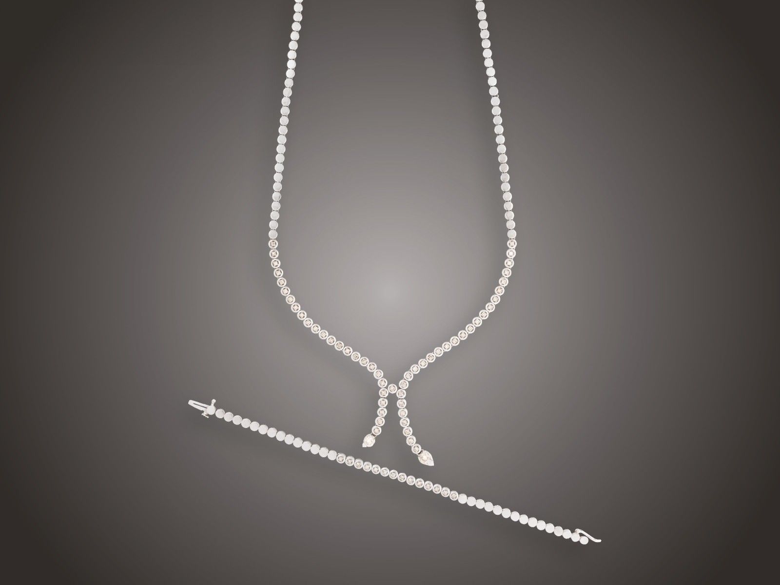 Fehérarany 750, nyakék és karkötő, 2 nagyobb konyakszínű briliáns cca. 0,80 ct és 67 kisebb briliáns cca. 2,70 ct (MYP1) ékítéssel, 59,5 g, hossz: 46, 18 cm