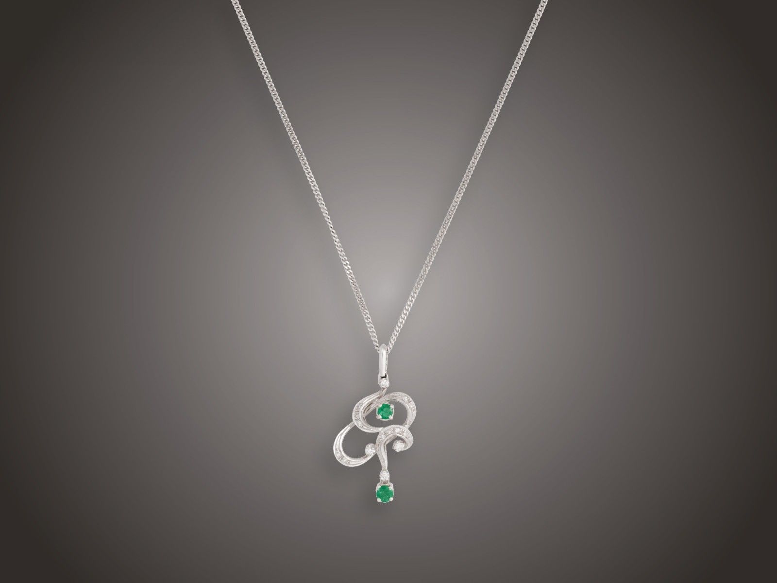 Kikiáltási ár: 350 000 FtLánc smaragd függővel Fehérarany 585, vékony anker láncon karmazált fazonú függő, 1 smaragd cca. 0,60 ct, 20 modern csiszolású briliáns cca. 0,20 ct, I, SI2, 2,9 g, hossz: 50 cm