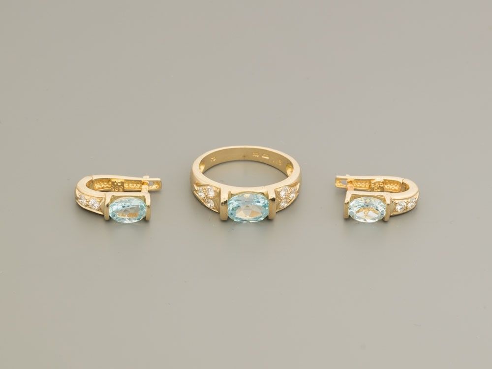Arany 585, női gyűrű és fülbevaló pár, topáz és 10 apró briliáns cca. 0,40 ct (MTCrSi) ékítéssel, 8,2 g, átmérő: 17,4 mm