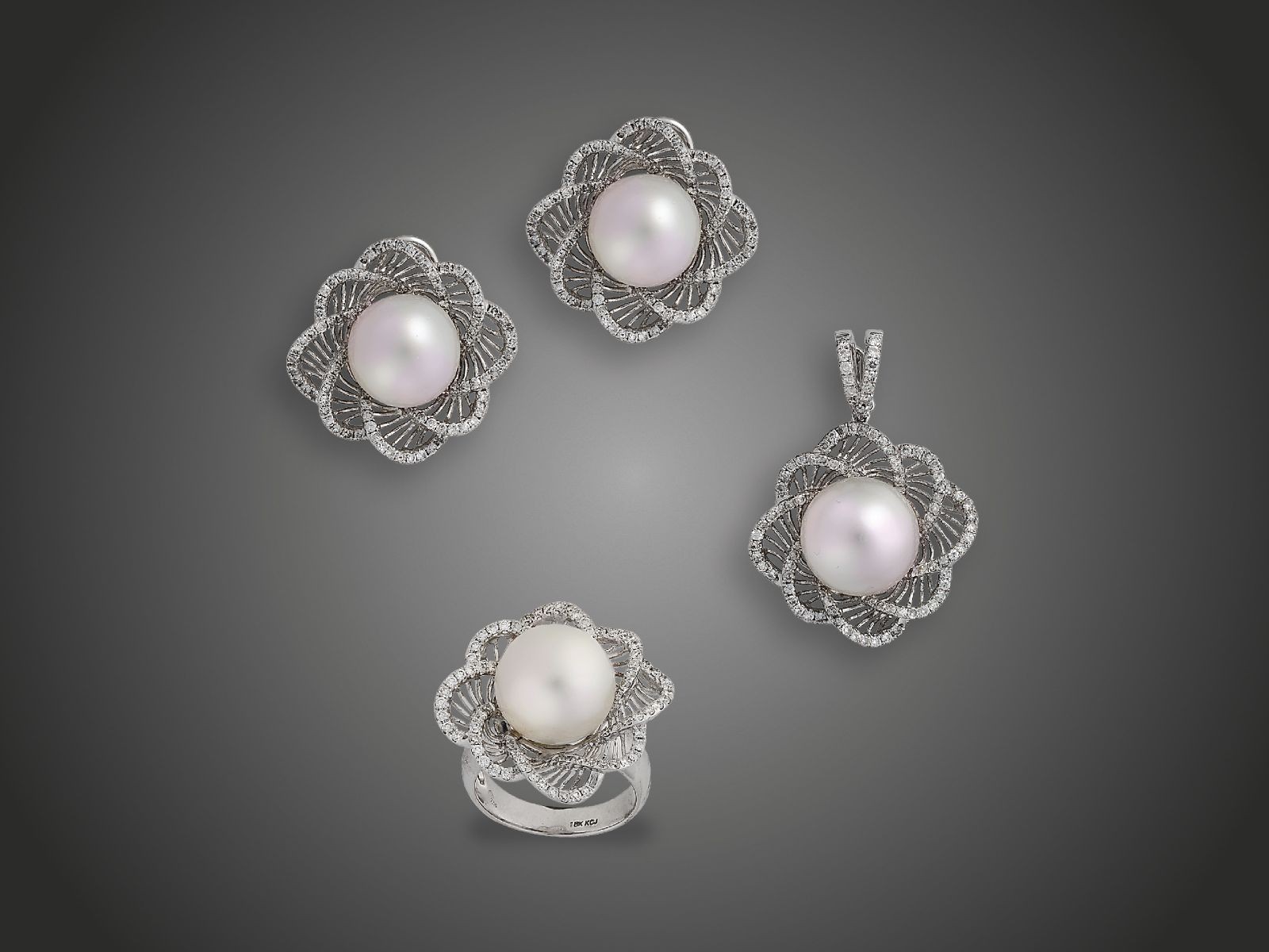 Fehérarany 750, függő, fülbevaló pár, női gyűrű, íves, áttört foglalatokon 336 apró briliáns cca. 3,30 ct (MCrP1), közepükben 4 déltengeri tenyésztett gyöngy, szemátmérő: 12,0-12,6 mm, beszúrós stift