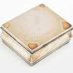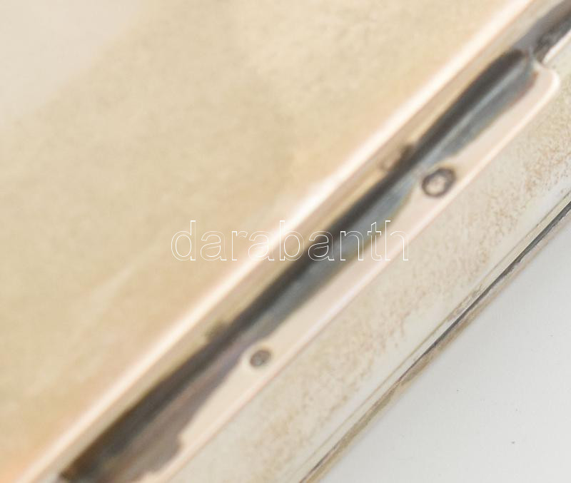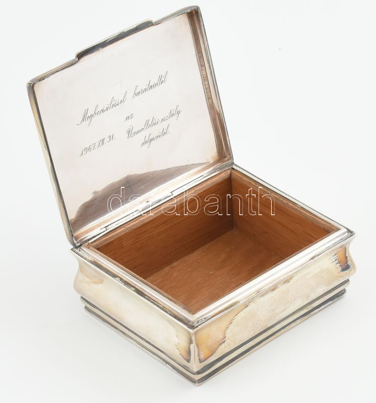 Ezüst (Ag) doboz, fabetéttel, fedelén belül vésett szöveggel, jelzett, 11x9cm, nettó: 156,4 g
