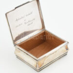 Ezüst (Ag) doboz, fabetéttel, fedelén belül vésett szöveggel, jelzett, 11x9cm, nettó: 156,4 g<a href="https://www.darabanth.com/hu/gyorsarveres/438/kategoriak~Nemesfem-disztargyak-ekszerek-dragakovek/Nemesfem-disztargyak-ekszerek-dragakovek~1000028/