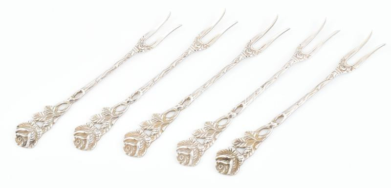 Ezüst(Ag) 5 db rózsás nyelű sajtvilla, jelzett, h: 10,4 cm, nettó: 25,5 g<a href="https://www.darabanth.com/hu/gyorsarveres/439/kategoriak~Nemesfem-disztargyak-ekszerek-dragakovek/Nemesfem-disztargyak-ekszerek-dragakovek~1500003/EzustAg-5-db-rozsas-