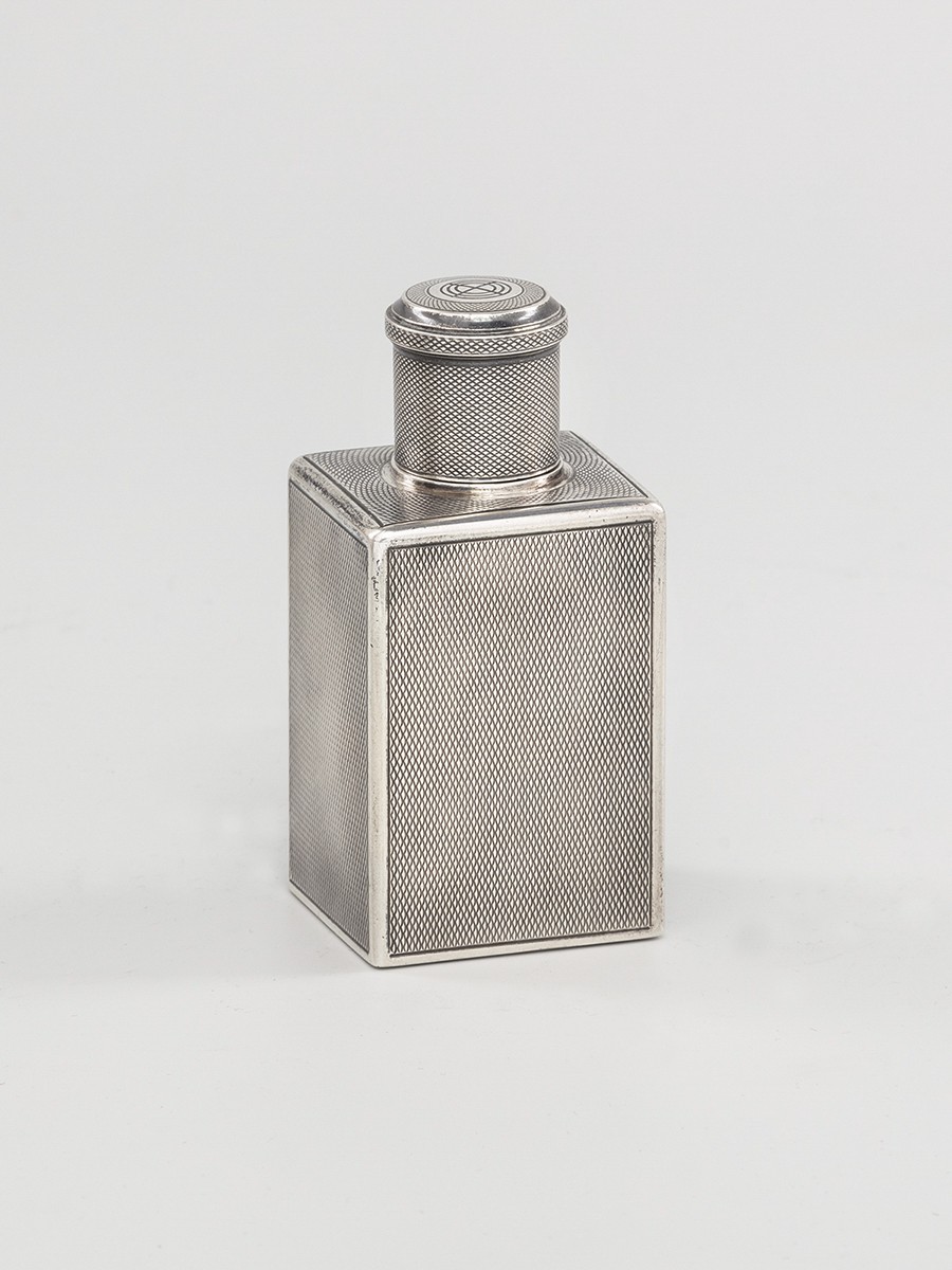 Ezüst, 102 g., belül aranyozva. Téglatest forma, menetes záródású kupakkal, felületén gilosált díszítménnyel.