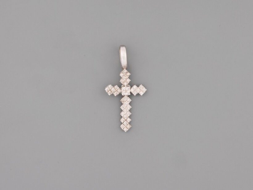 Fehérarany 585, keresztforma, 41 apró care foglalt briliáns cca. 0,30 ct (MCrP1) ékítéssel, nagy akasztókarikával, 4,3 g