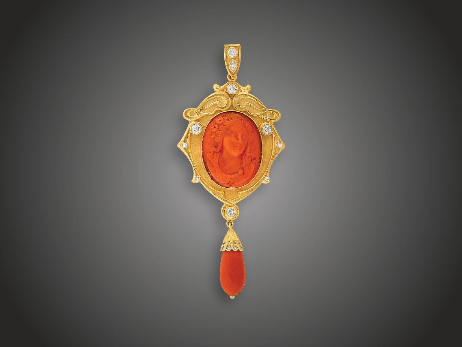 Arany 585, faragott korall camea és cseppcsüngő szecessziós mintán, 6 nagyobb, régi csiszolású briliáns cca. 1,20 ct (R2CrP1)és 14 kis briliáns cca. 0,20 ct (MCrSi) ékítéssel, 27,9 g