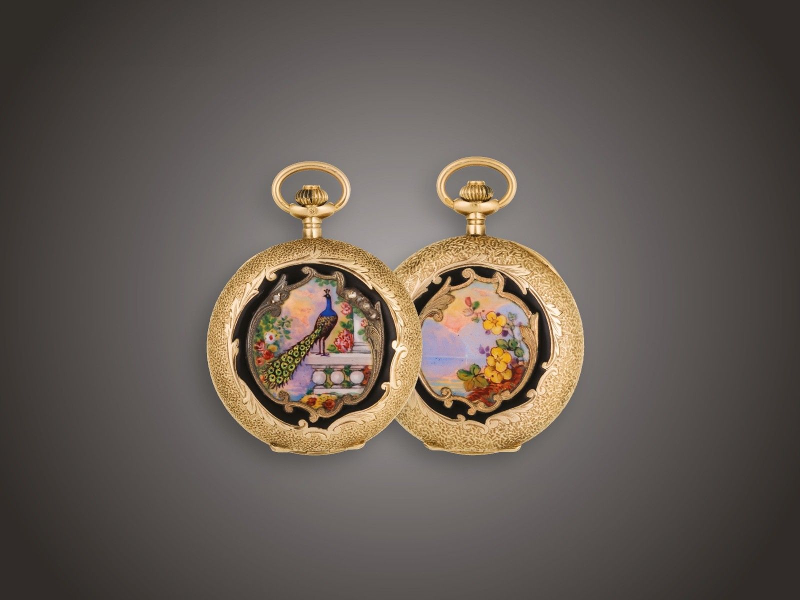 Arany 585, mindkét fedelén festett, zománcozott miniatűr, előlapján 4 apró gyémánt ékítéssel, római számos másodperckörös zománcozott számlap, 10 köves cilinderjáratú működő szerkezet, Svájc, 1900 körül, tokszám: 267109, bruttó 2