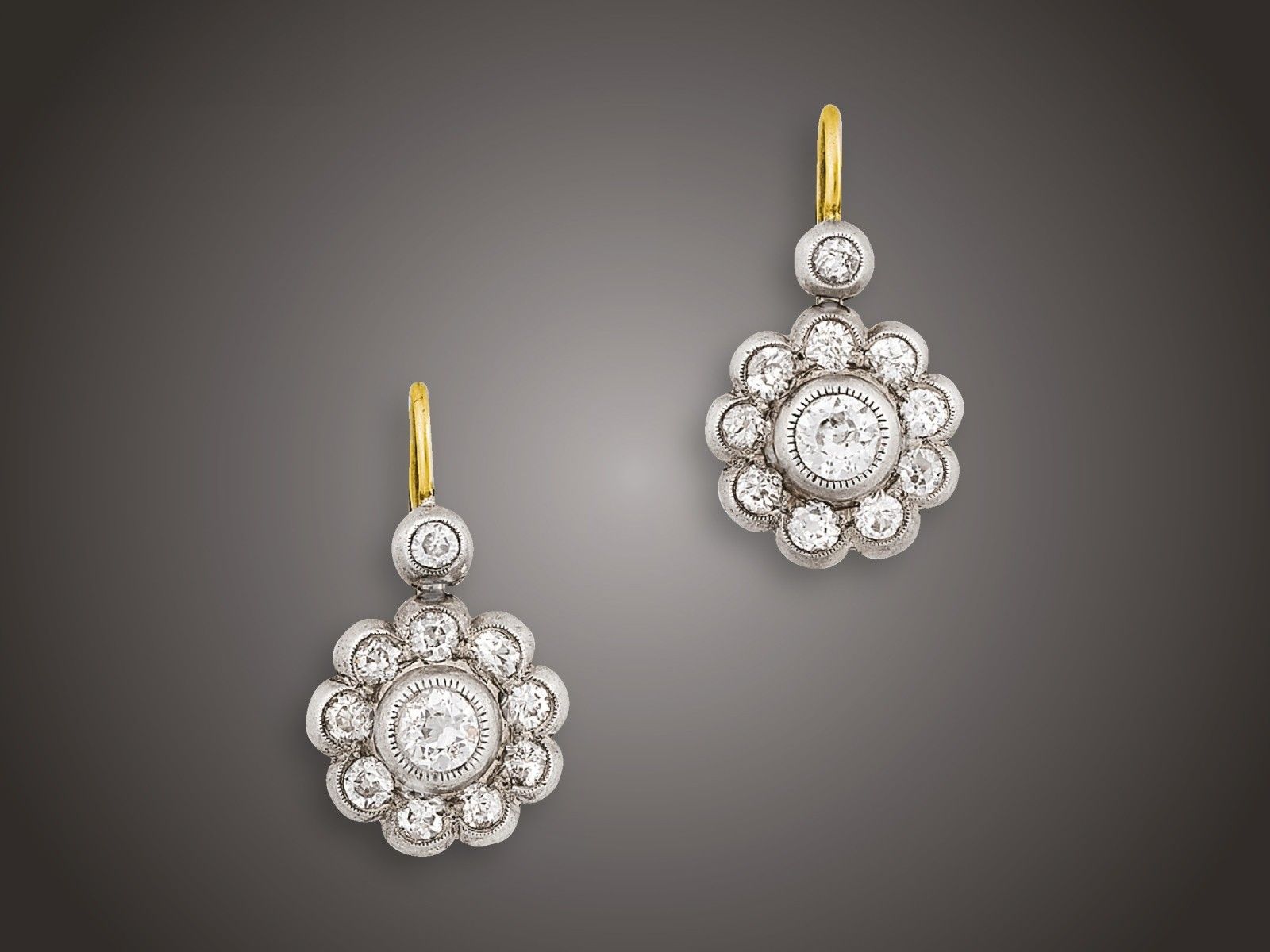 Arany 585, 2 nagyobb és 20 kisebb régi csiszolású briliáns cca. 2,10 ct (R2CrP1-P2) csüngős rozetta fazonban, patentzáras beakasztással, 1930 körül, után fémjelzett, 6,0 g
