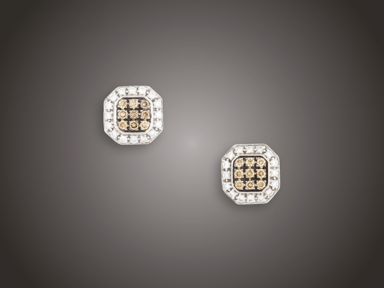 Fehérarany 585, nyolcszögletes forma közepében 18 apró pave foglalt konyakszínű (MYSi) és 32 apró színtelen (MCrSi) briliánssal keretezve, briliáns összesen cca. 1,00 ct, beszúrós stiftes szereléssel, 5,6 g