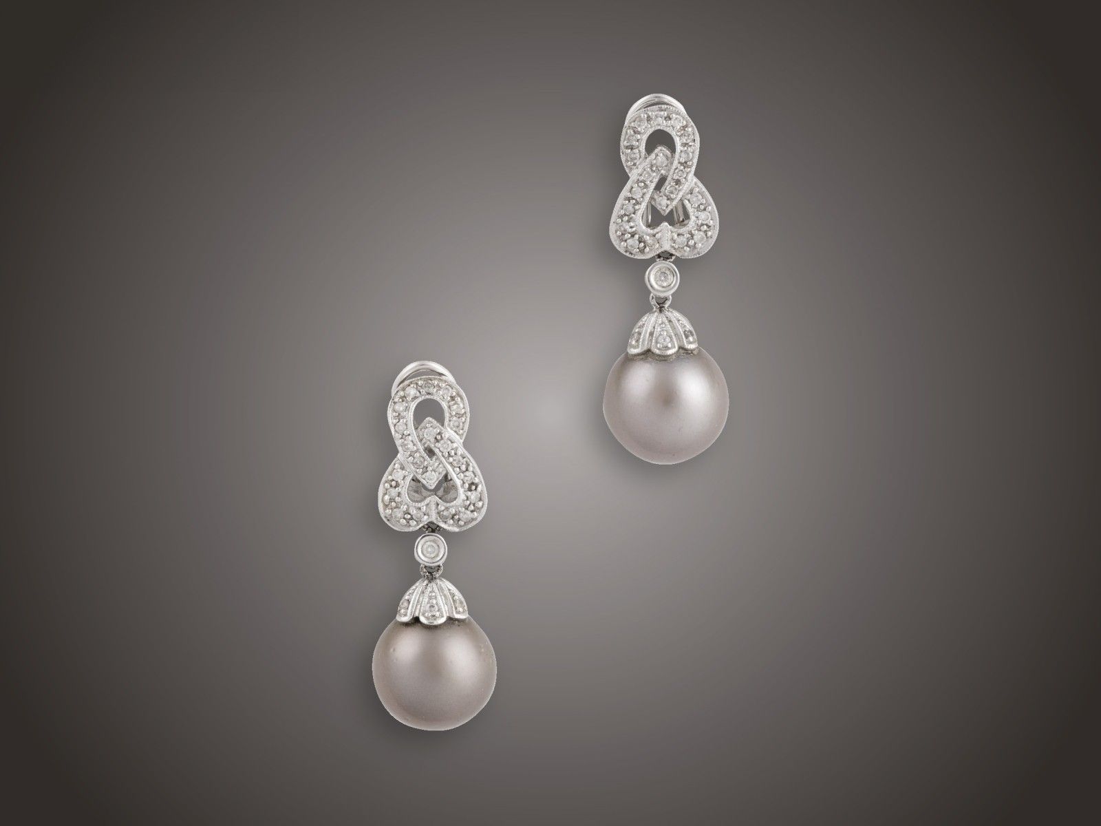 Fehérarany 585, felső részén egybefonódó szív és csepp motívum, 52 apró briliáns cca. 0,50 ct (MCP1) ékítéssel, tahiti gyöngy csüngővel, szemátmérő: 12,0 mm, beszúrós stiftes patentzárral, 11,1 g