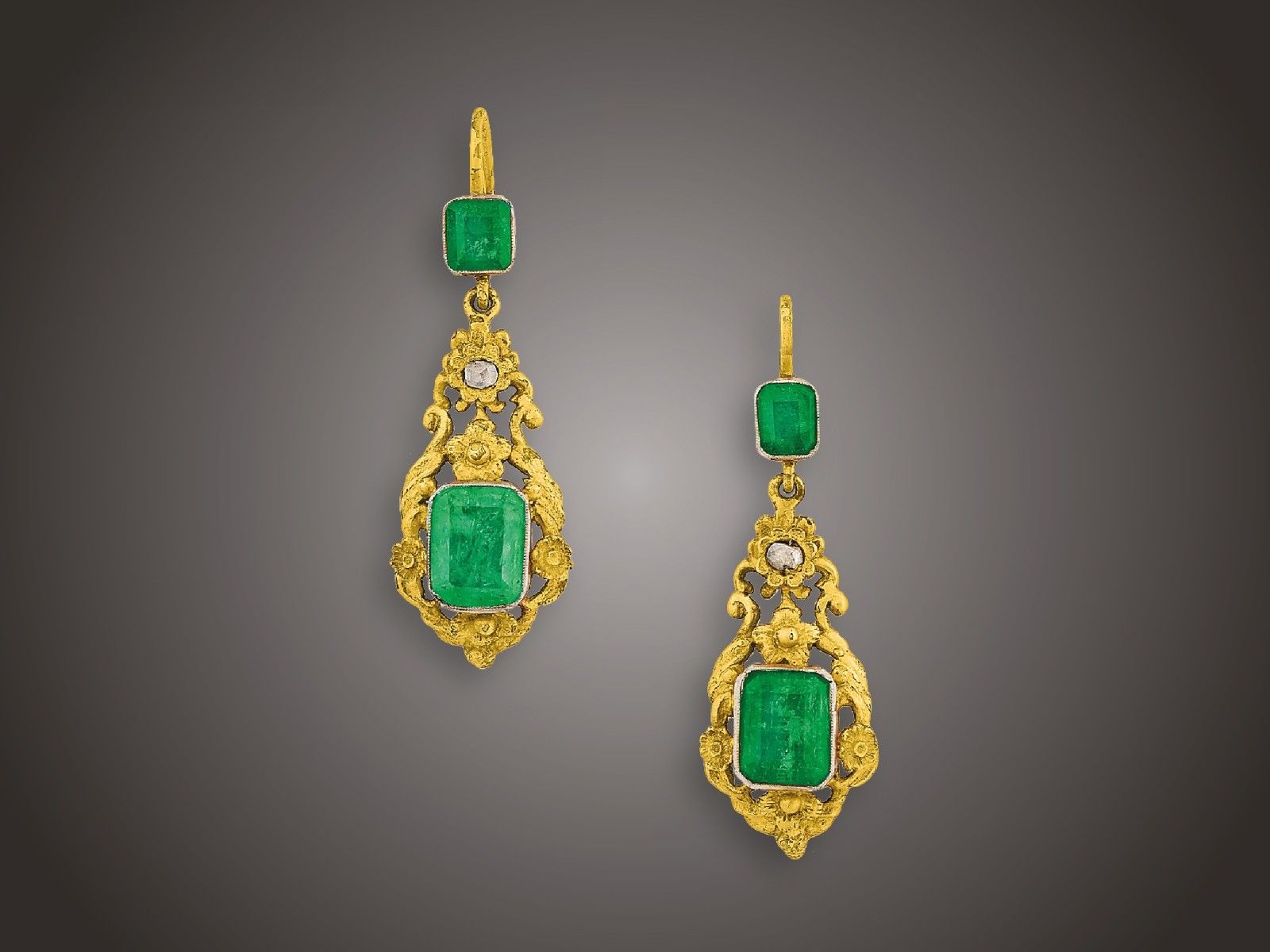 Aranyozott ezüst 835, úgynevezett ötvös ékszer, 2 nagyobb és 2 kisebb szögletes csiszolású smaragd cca. 6,00 ct, természetes zárványokkal, 2 rózsacsiszolású gyémánt cca. 0,10 ct ékítéssel, patentzáras beakasztással, 1930 körül, után