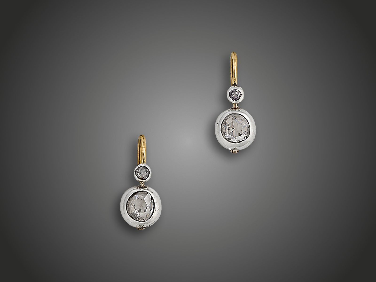 Arany 585, 2 nagyobb és 2 kicsi, rózsacsiszolású gyémánt cca. 0,60 ct, patentzáras beakasztással, 1930 körül, után fémjelzett, 3,5 g