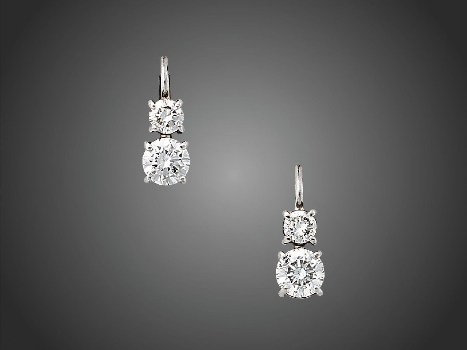 Kikiáltási ár: 260 000 FtSmaragd fülbevalópár Fehérarany 585, 2 ovális smaragd cca. 1,30 ct, 32 modern csiszolású briliáns cca. 0,42 ct, J, SI-P1, 3,1 g