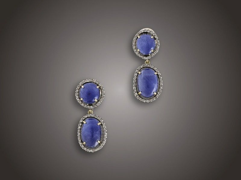 Fülbevaló pár Ezüst 925, 4 kaboson csiszolású zafír cca. 16,00 ct és 110 apró achtkant csiszolású briliáns cca. 0,80 ct (ACP2) ékítéssel, beszúrós stiftes klipsz szereléssel, 13,2 g