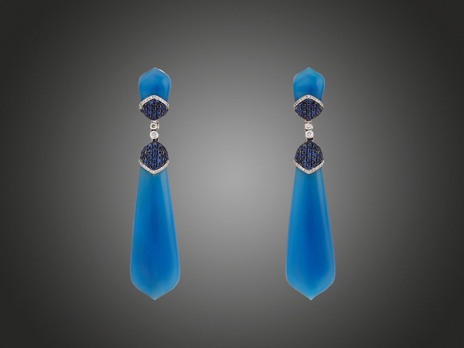 Fehérarany 585, csüngős fazon, pave foglalt 42 kék zafír és 60 achtkant csiszolású gyémánt cca. 0,30 ct, K, SI2, kék achát csüngőkkel, beszúrós patent szereléssel, 19,5 g, achátok festettek