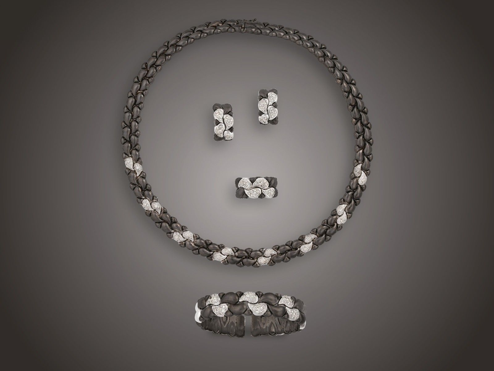 Arany 750, nyakék, fülbevaló pár, nyitott végű karék és gyűrű, fekete ródium díszítéssel, csepp alakú elemeken pave foglalt 268 apró briliáns cca. 4,30 ct (MTCrVs) ékítéssel, beszúrós stiftes klipsz szereléssel, 232,3 g,