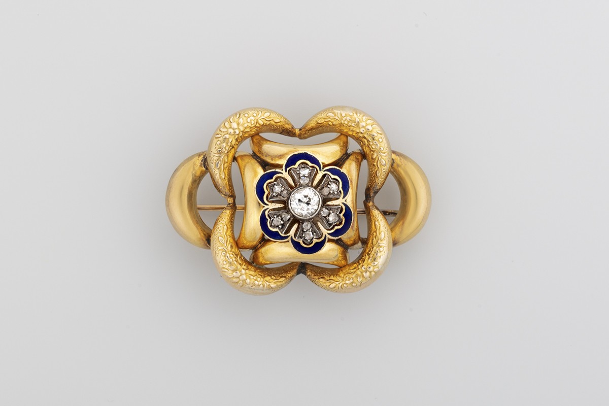 Arany 585‰, rozetta forma zománc díszítésű középrésszel, 1 régi csiszolású briliáns cca. 0,35 ct, K, P1, 12 apró gyémánt, 12,5 g.