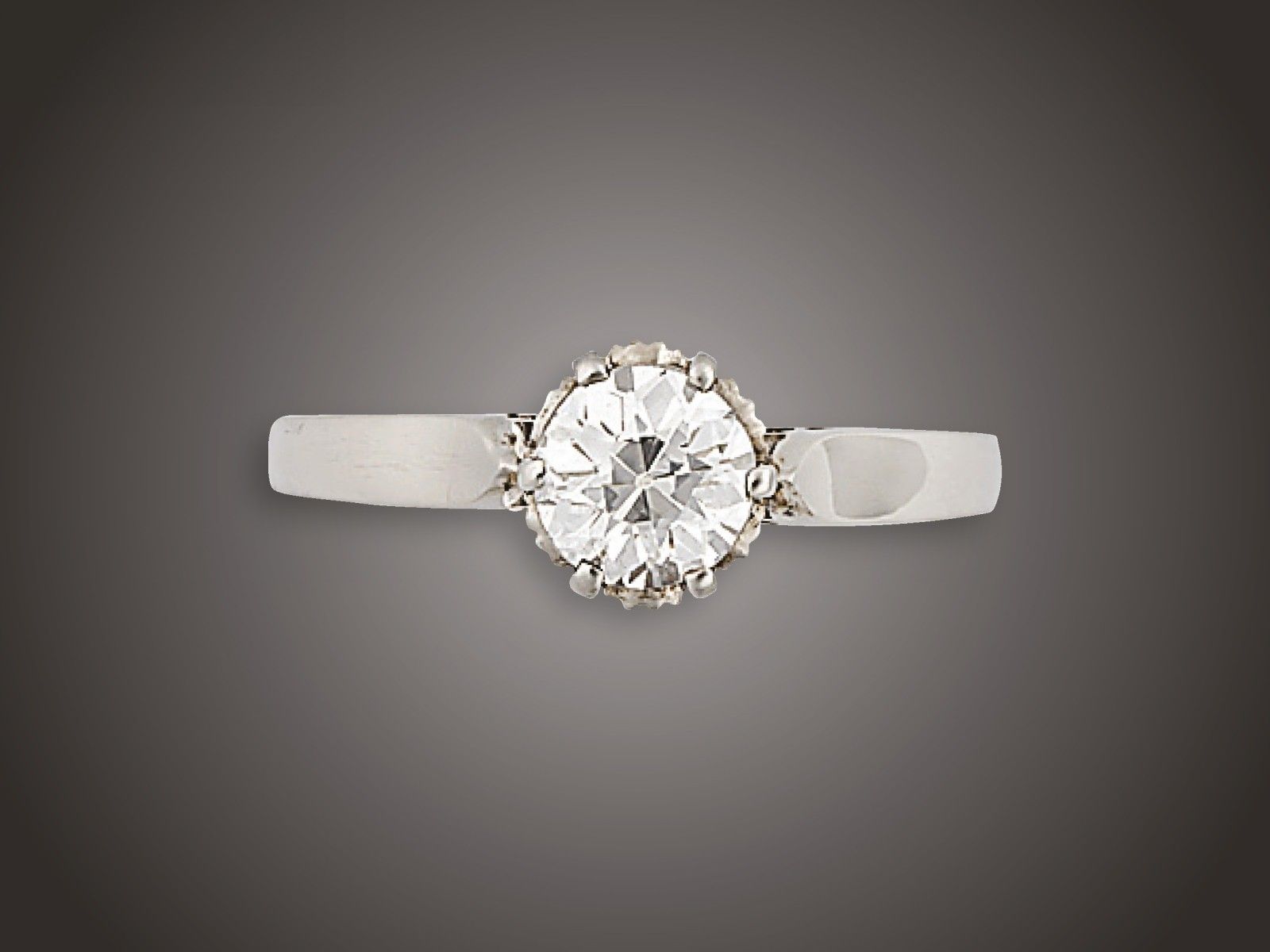 Fehérarany 585, karmos foglalatban 1 régi csiszolású briliáns cca. 0,80 ct (R2CrSi) ékítéssel, 2,6 g, átmérő: 16,6 mm