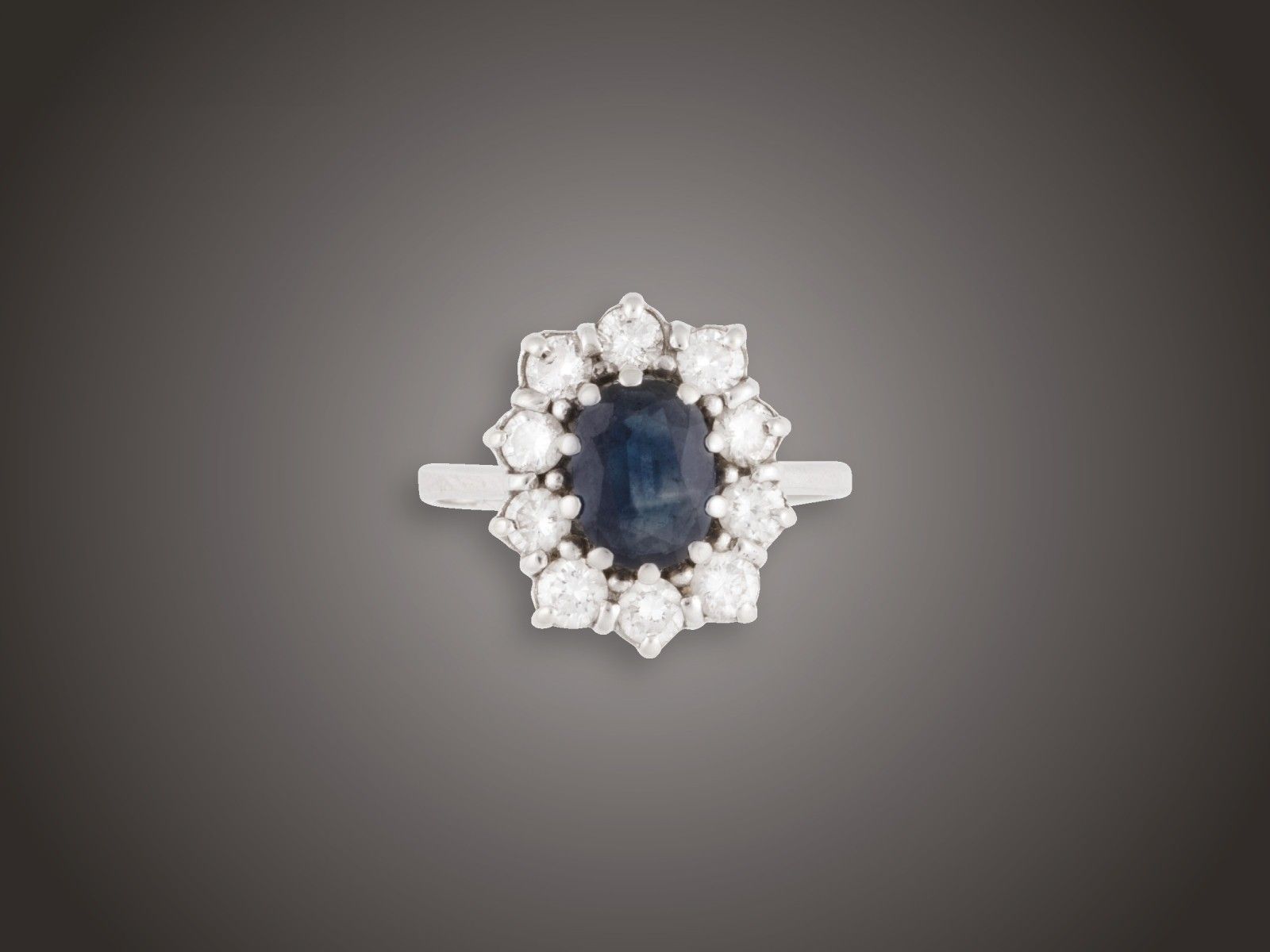 Fehérarany 585, karmazált fazon, 1 zafír cca. 1,00 ct és 10 karmos foglalású briliáns cca. 0,70 ct (MTCrVSi) ékítéssel, 3,2 g, átmérő: 16,0 mm