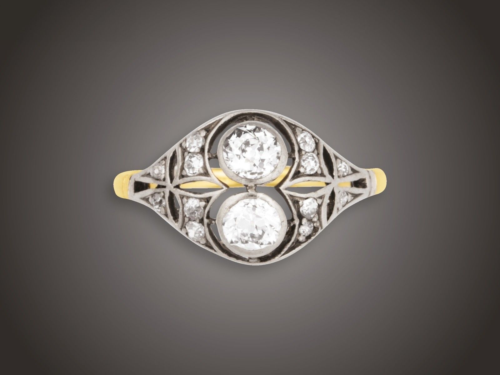 Kikiáltási ár: 190 000 FtArt deco briliáns gyűrű Fehérarany 585, geometrikus stílusú, 7 régi csiszolású briliáns és gyémánt cca. 0,60 ct, I, SI, után fémjelzett, 4,0 g, méret: 57