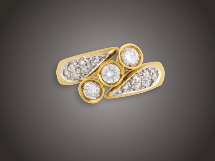Kikiáltási ár: 260 000 FtNői gyűrű Ezüst 835, geometrikus kialakítás, sorba foglalt 2 régi csiszolású briliáns cca. 0,20 ct, M, P1-P3, 1 smaragd cca. 0,20 ct, után fémjelzett, 2,7 g, méret: 54