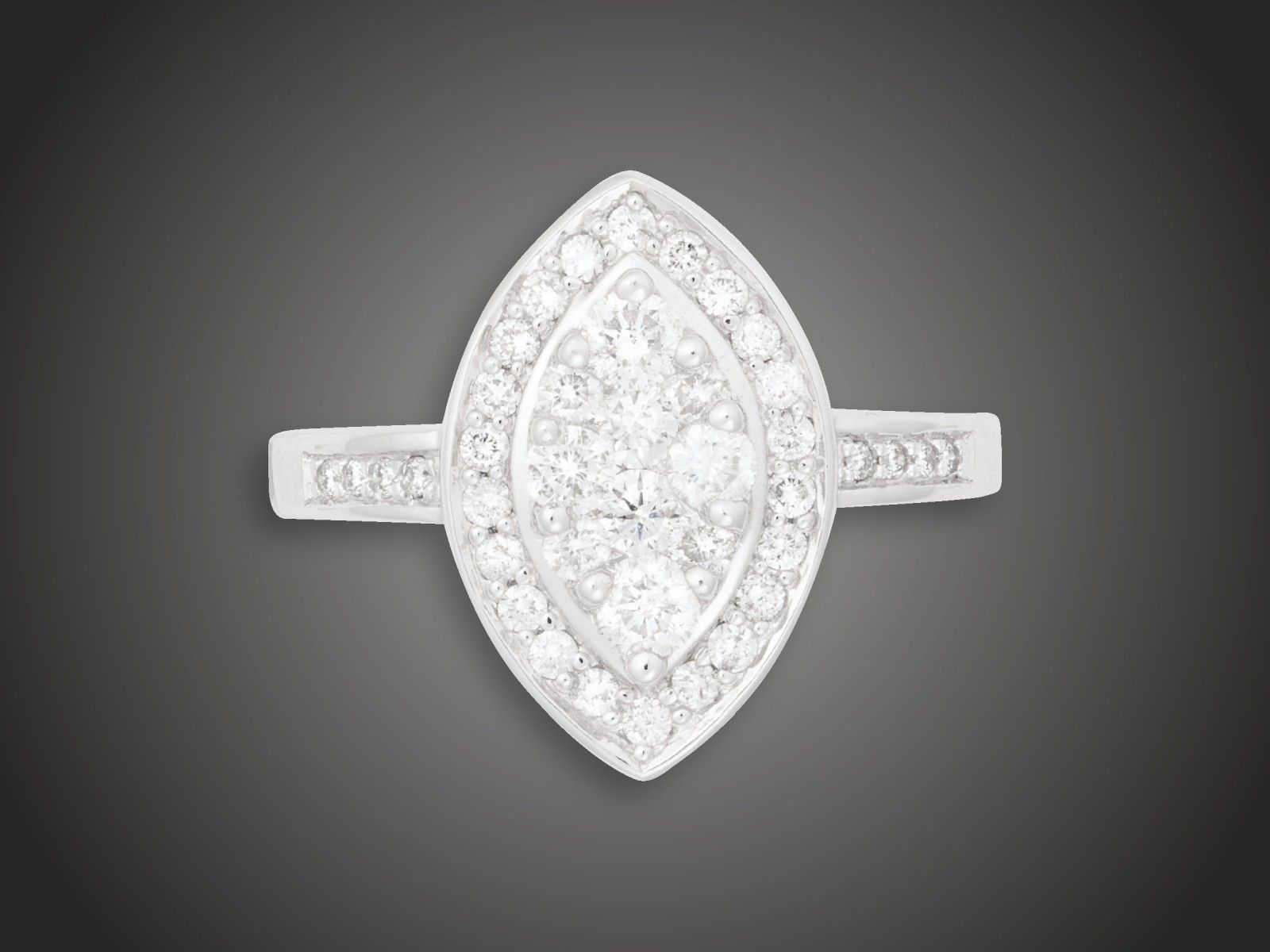 Fehérarany 585, navett formájú fej, 40 kisebb-nagyobb briliáns cca. 1,0 ct (MCrSi-P1) ékítéssel, 6,1 g, átmérő: 17,6 mm