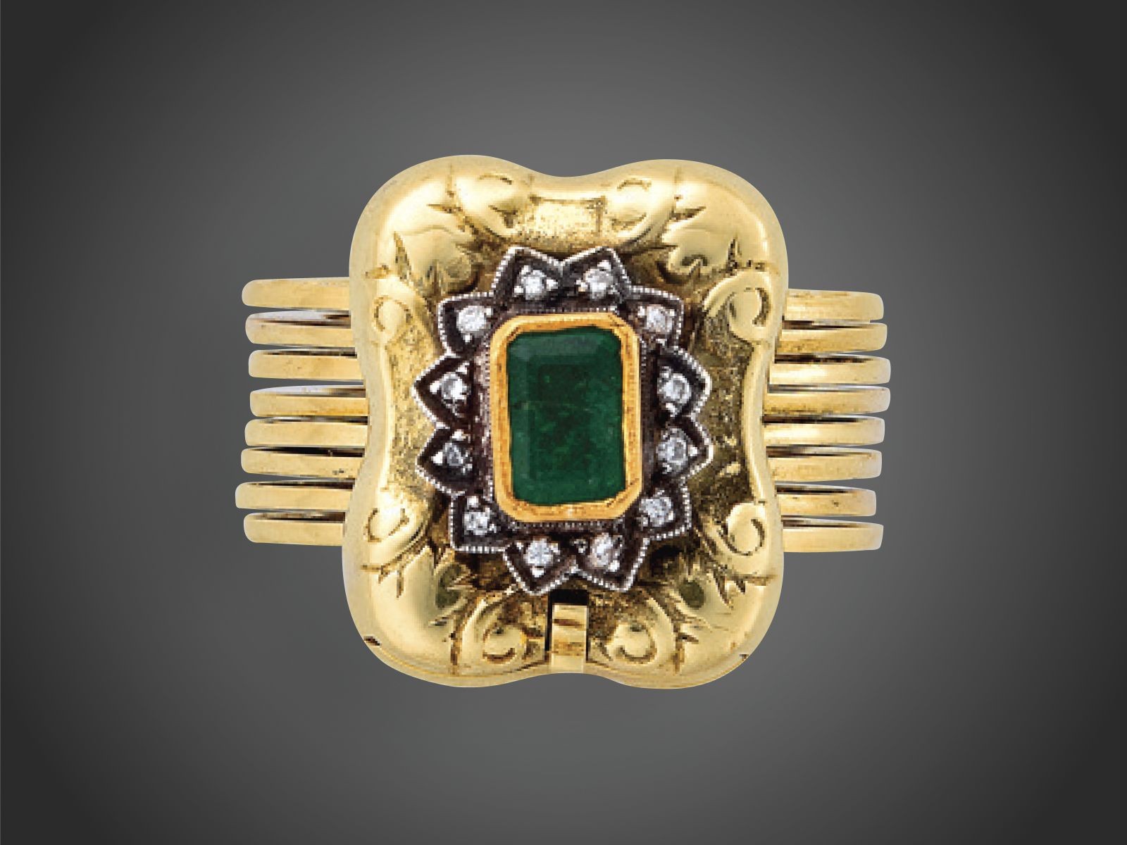 Kikiáltási ár: 680 000 FtSmaragd gyűrű Fehérarany 585, karmos foglaltban 1 ovális smaragd cca. 0,60 ct, 16 bagett és briliáns csiszolású gyémánt cca. 0,20 ct, I, VS, 2,6 g, méret: 50